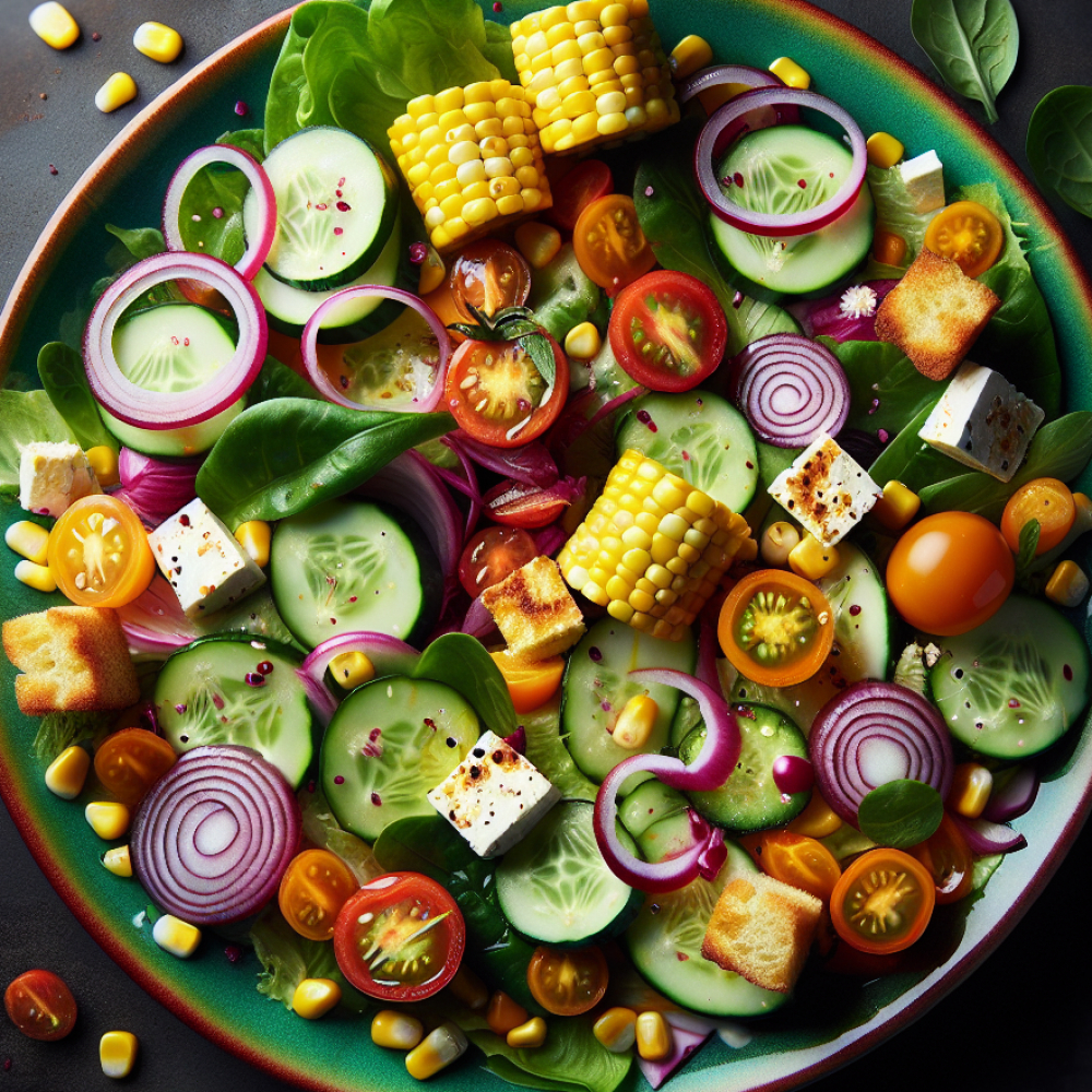 עלים ירוקים, חסה, מלפפון, עגבניה, בצל סגול, גמבה, בטטה אנטיפסטי, זיתי קלמטה, בתיבול שמן זית ולימון