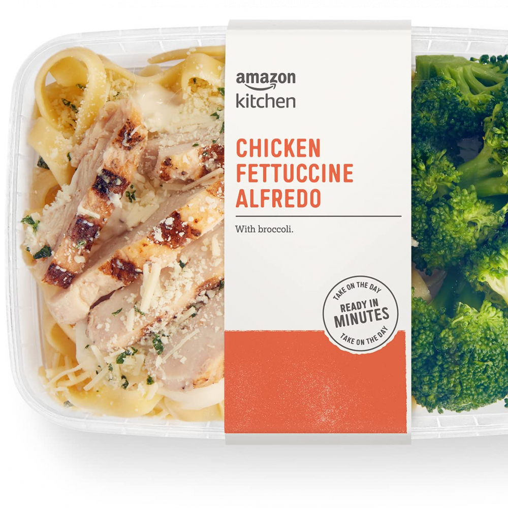 Chicken strips and fettuccine with broccoli, parmesan, romano, parsley, and alfredo sauce Ready in Minutes Microwave on high for 2.5 minutes