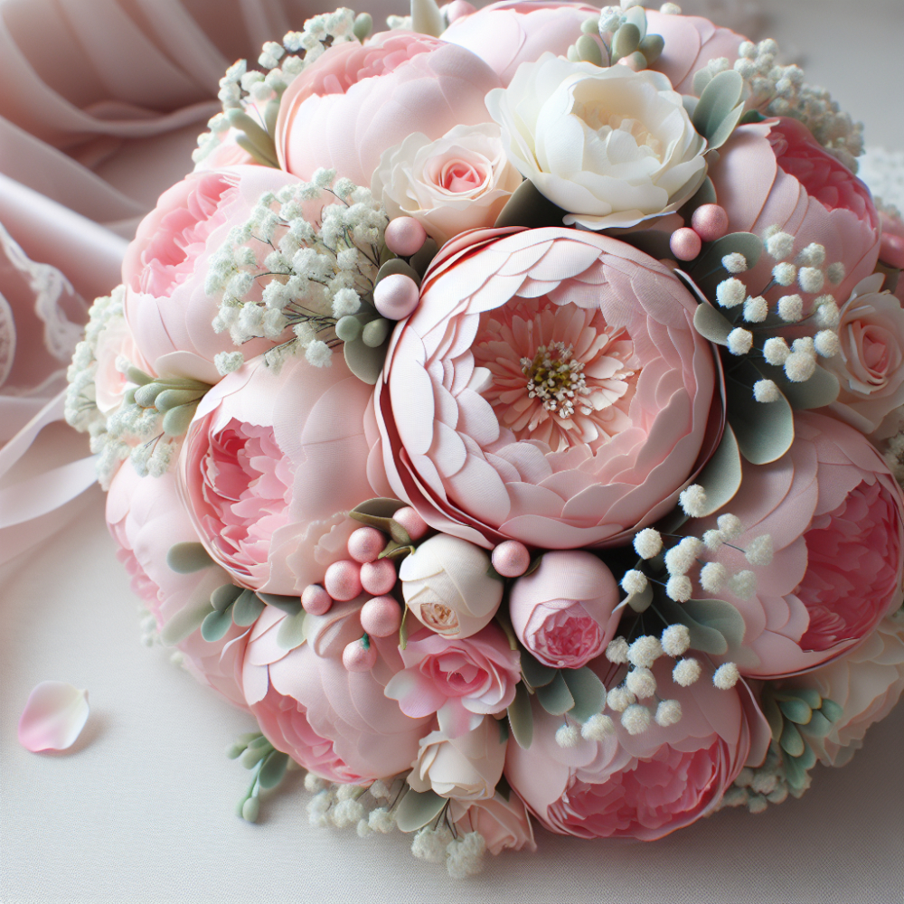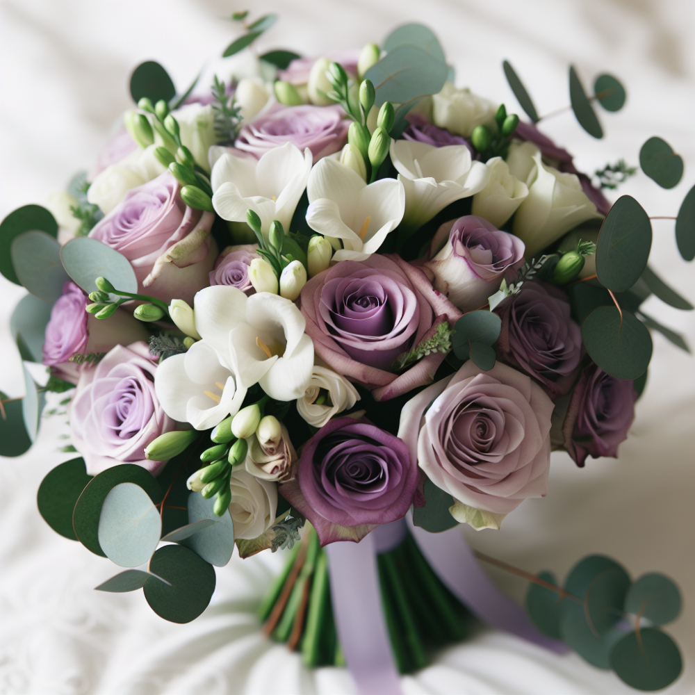 An elegant bouquet of white roses and orchids, adorned with a silver ribbon.